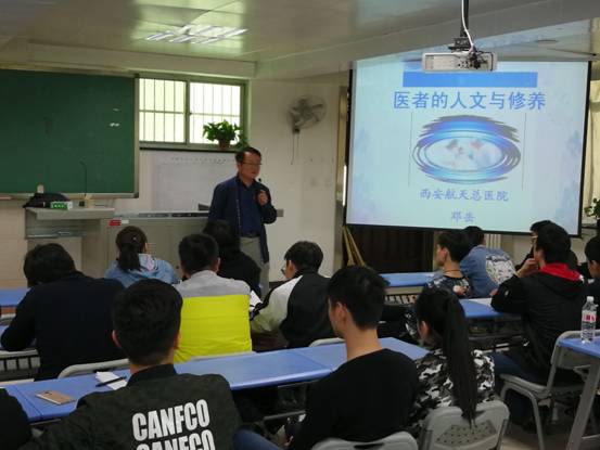 4月13日下午14:10, 西安市航天总医院人事部部长兼科教科主任邓岳老师来我校做“医者的人文与修养”专场报告会,报告会在1429教室顺利进行,大学生发展中心安排护理、建工等专业的学生认真聆听了此次报告。